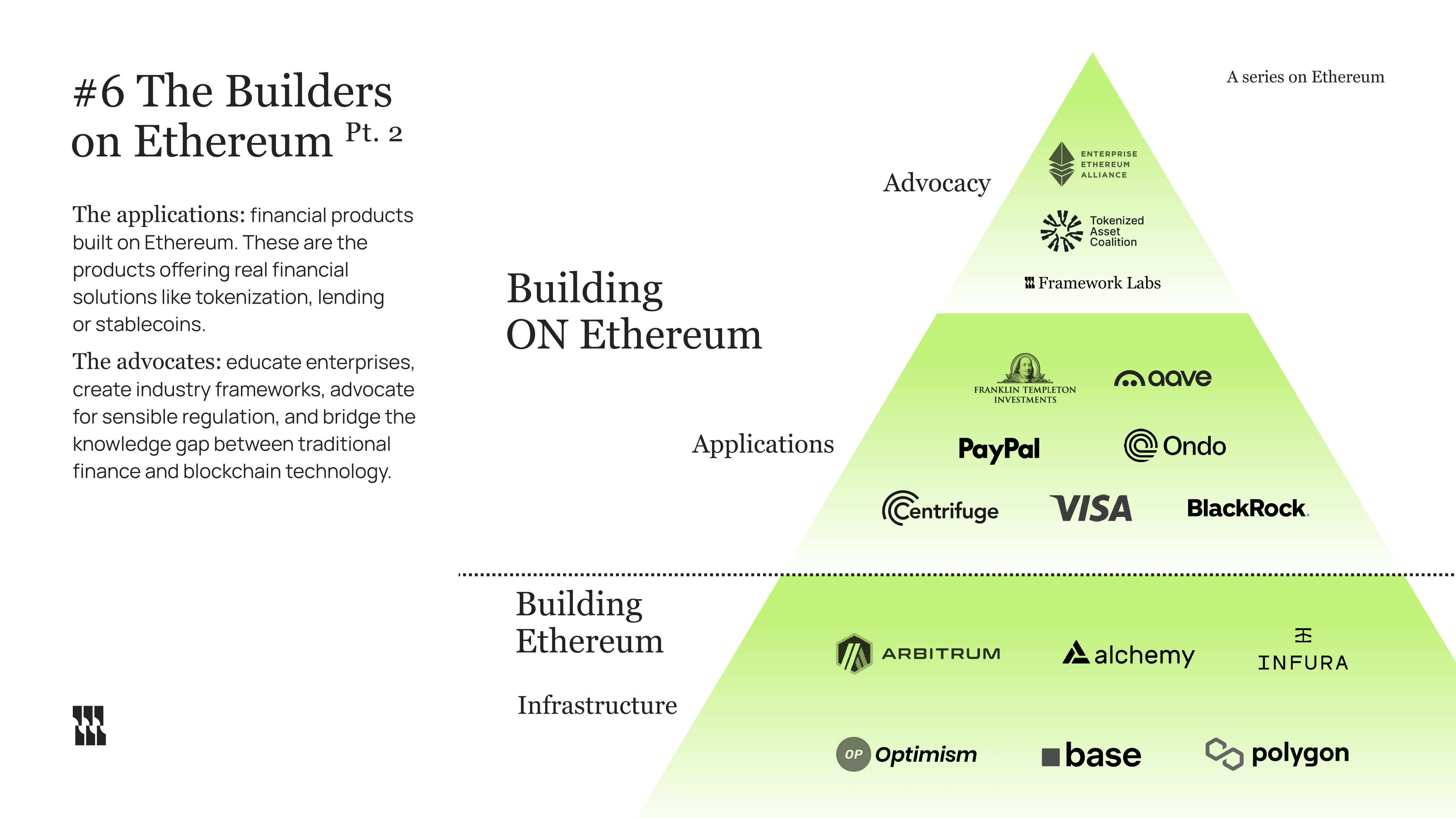 Part 2. In the previous post, we covered Ethereum's foundational layers. Let’s continue with the two missing layers: Applications & Advocacy